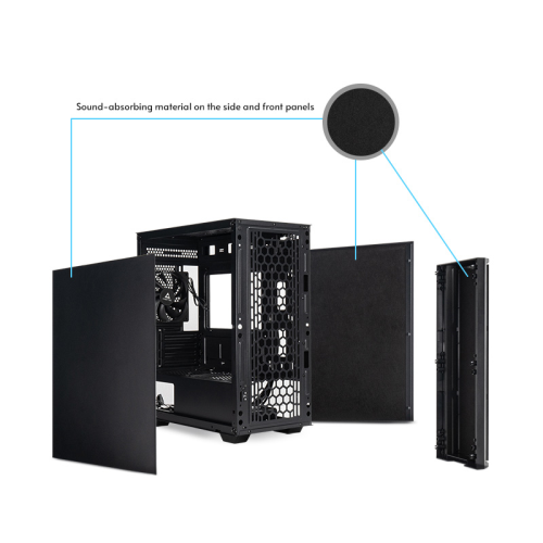 Anyag 0,6 mm SPCC, hangelnyelő anyaggal, Mini ITX, mATX, 360mm x 212mm x 420mm, 2x 2.5″ + 1x 3.5“ hely, 1x USB Type C, 1x USB3.0, 1x USB2.0, Audio-out (AZALIA / HD-Audio), Mic-In, 1x hátsó ventilátor telepítve, CPU cooler height (max.) 165mm, VGA card le