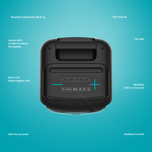 Hordozható hangszóró 80 W teljesítménnyel, Bluetooth 5.3, TWS funkció, BeatBass® technológia, FM rádió, vezeték nélküli mikrofon, 9 LED-es effekt, széles körű csatlakoztathatóság, különböző formátumok támogatása, 13 órás akkumulátor-üzemidő.